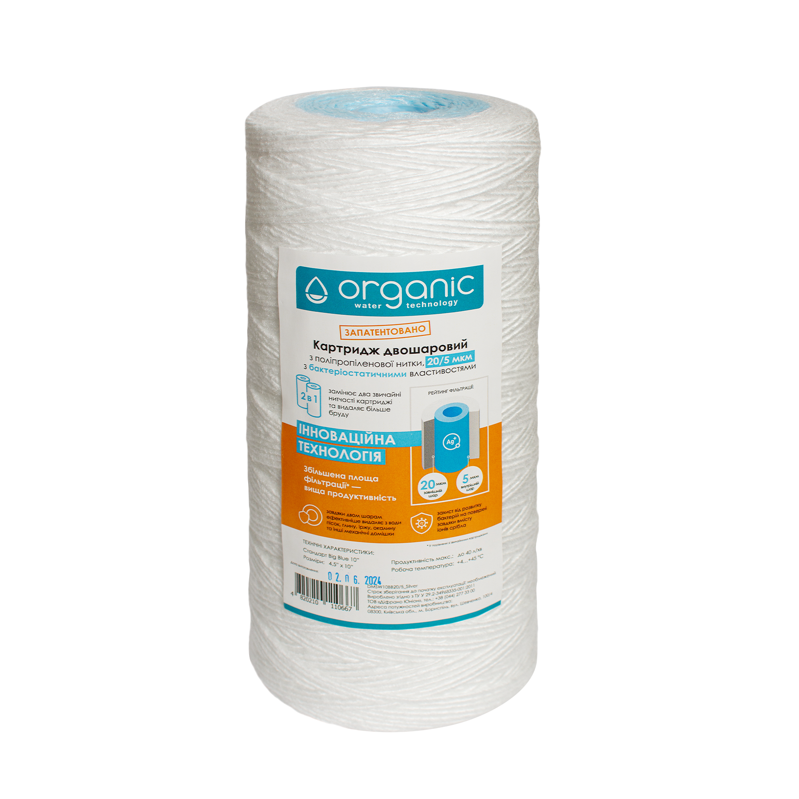 Двухслойный картридж из полипропиленовой нити Organic DMSW10BB 20/5 с бактериостатическими свойствами. Изготовлен по инновационной технологии, которая позволяет значительно увеличить производительность фильтрации.