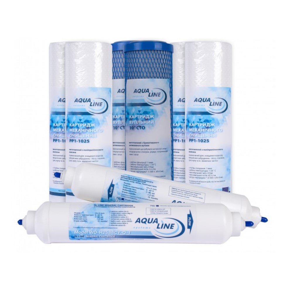 Полный комплект сменных картриджей Aqualine RO-6 предназначен для шестиступенчатых систем обратного осмоса. Набор включает 6 префильтров (по 2 шт каждой ступени) и 2 постфильтра — угольный постфильтр и минерализатор. Это готовое решение для обслуживания системы на 1 год при стандартном потреблении воды.