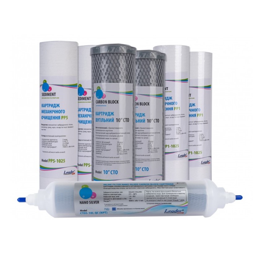 Полный комплект картриджей для фильтра воды Leader RO-5. Набор состоит из 7-ти элементов: