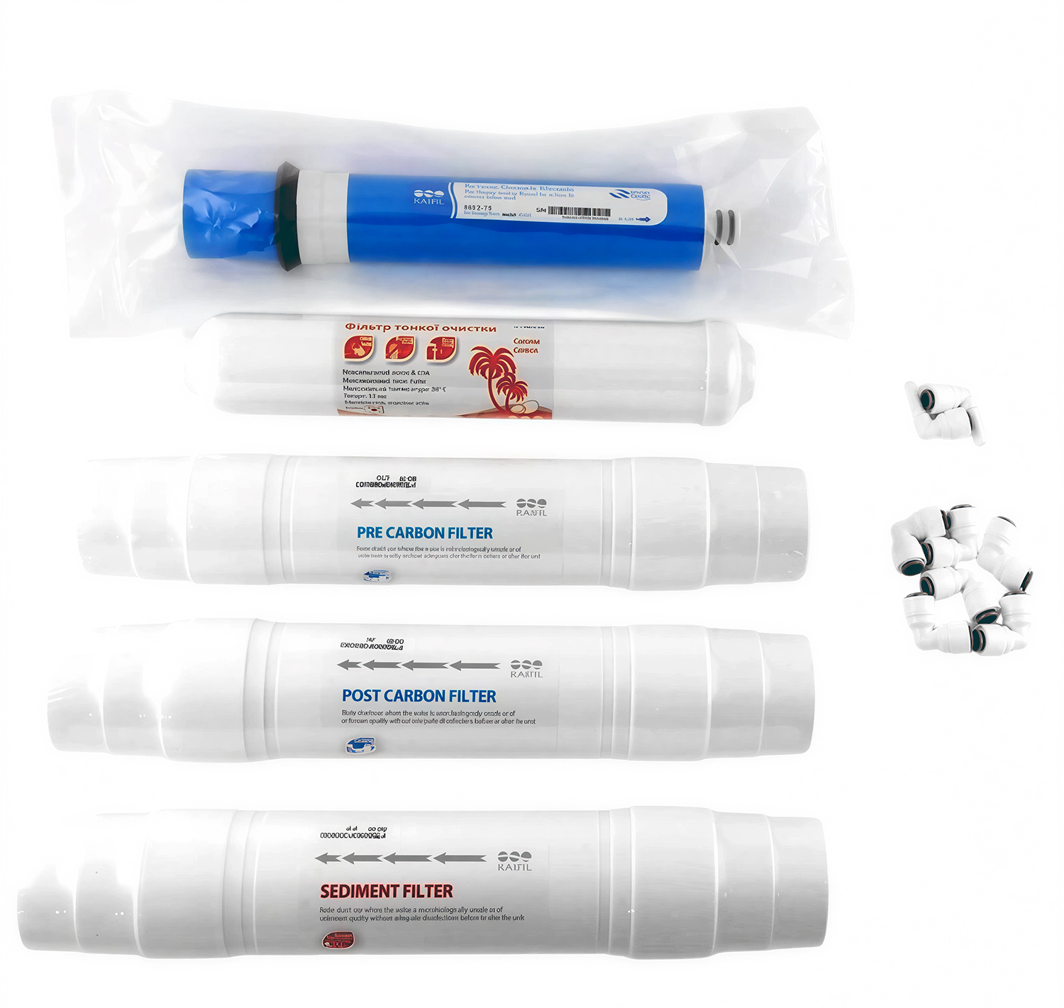 Повний набір змінних картриджів та фітингів для систем зворотного осмосу з форматом 11″, повністю сумісних із фільтрами BWT AQA Source та аналогами на базі RAIFIL Korea. Нижче — короткий опис кожного елемента комплекту: