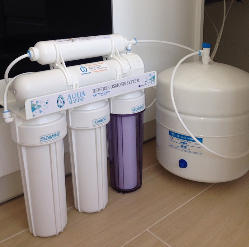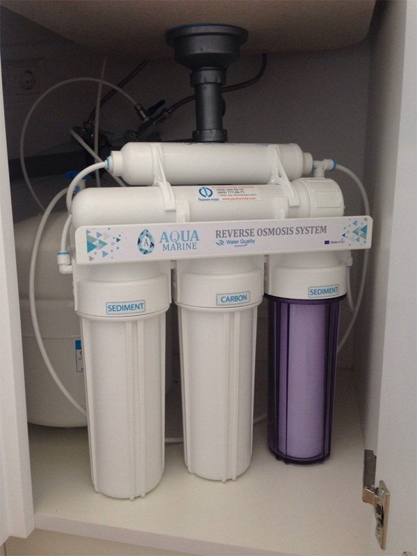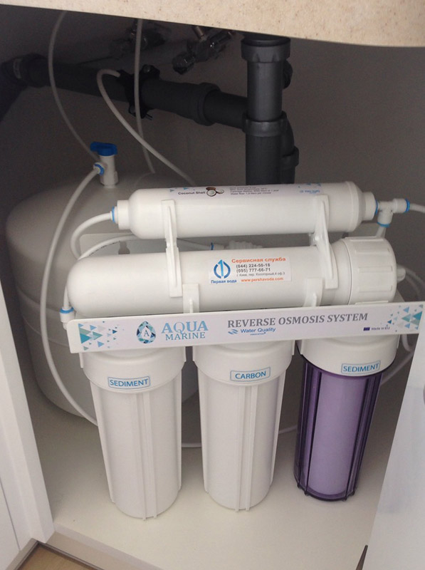 Фільтраційний блок та накопичувальний бак встановлюються під мийкою або в іншому місці, захищеному від прямих сонячних променів. Фільтраційний блок з баком можуть розташовуватися як поруч, так і на певному видаленні, обмеженому довжиною трубки, що приєднує. Монтажні роботи включають встановлення та закріплення фільтраційного блоку, монтаж подвійного крана подачі очищеної води, підключення дренажного хомута для зливу, а також муфти та крана забору вихідної води з водопроводу.