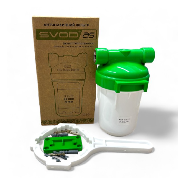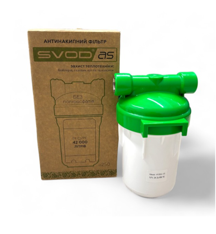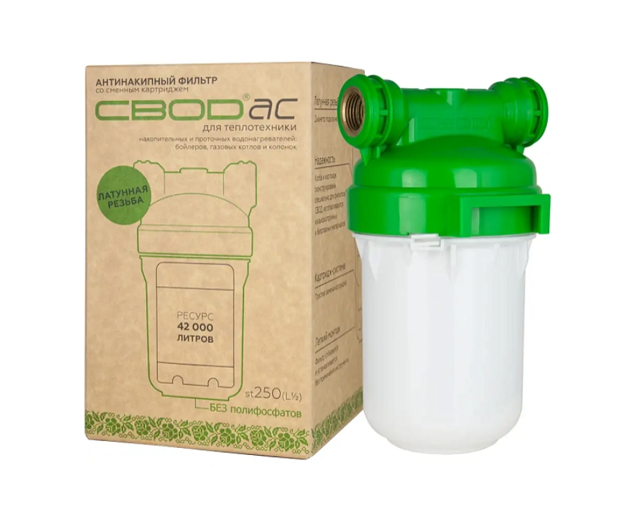 Фільтр СВОД-АС ST-250 з картриджем призначений для захисту водонагрівального обладнання, таких як бойлери, котли, пральні та посудомийні машини, від накипу та сольових відкладень. Завдяки використанню фільтра значно скорочуються витрати на електроенергію та миючі засоби, а також продовжується термін служби обладнання. Фільтр не тільки запобігає утворенню нових відкладень, а й поступово видаляє вже існуючий накип.