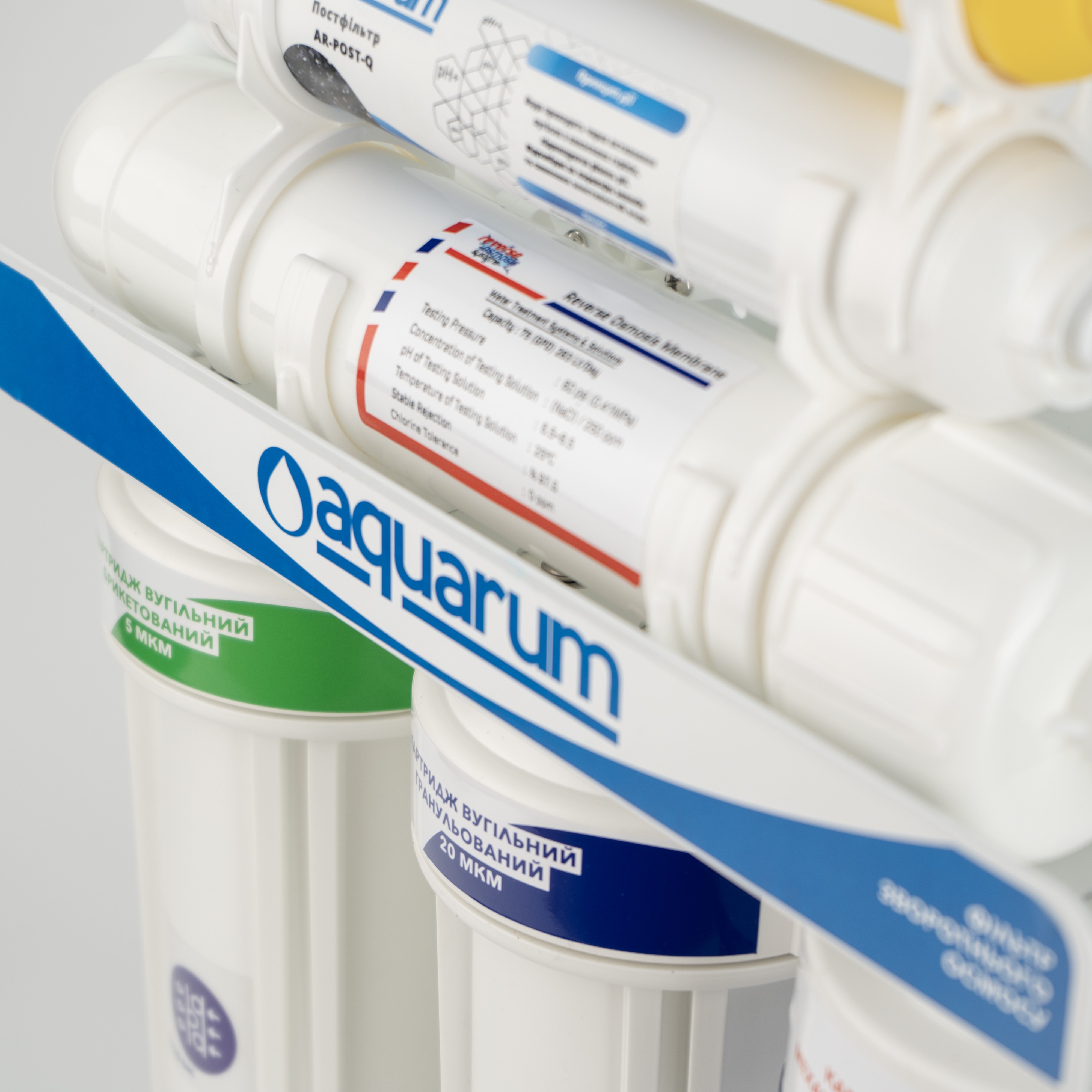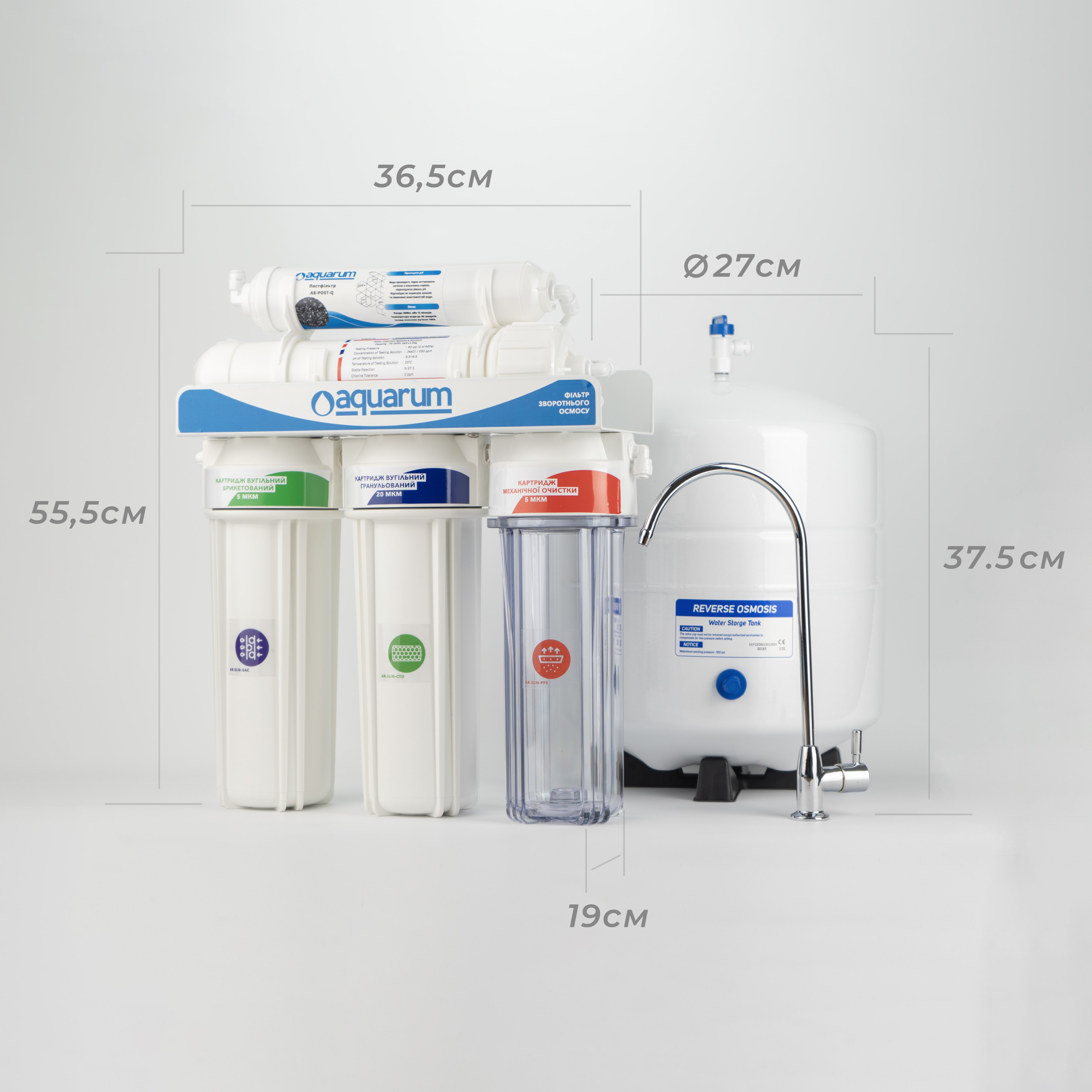 Aquarum Simple RO-5 – це система очищення води на основі зворотного осмосу, призначена для доочищення води в побутових умовах з метою використання для пиття, приготування їжі та інших цілей. Вона видаляє до 99,9% усіх домішок, що містяться у воді, і запобігає утворенню накипу в нагрівальних приладах. Фільтрація здійснюється завдяки проходженню води під натиском через напівпроникну мембрану, яка пропускає лише молекули води та кисню.