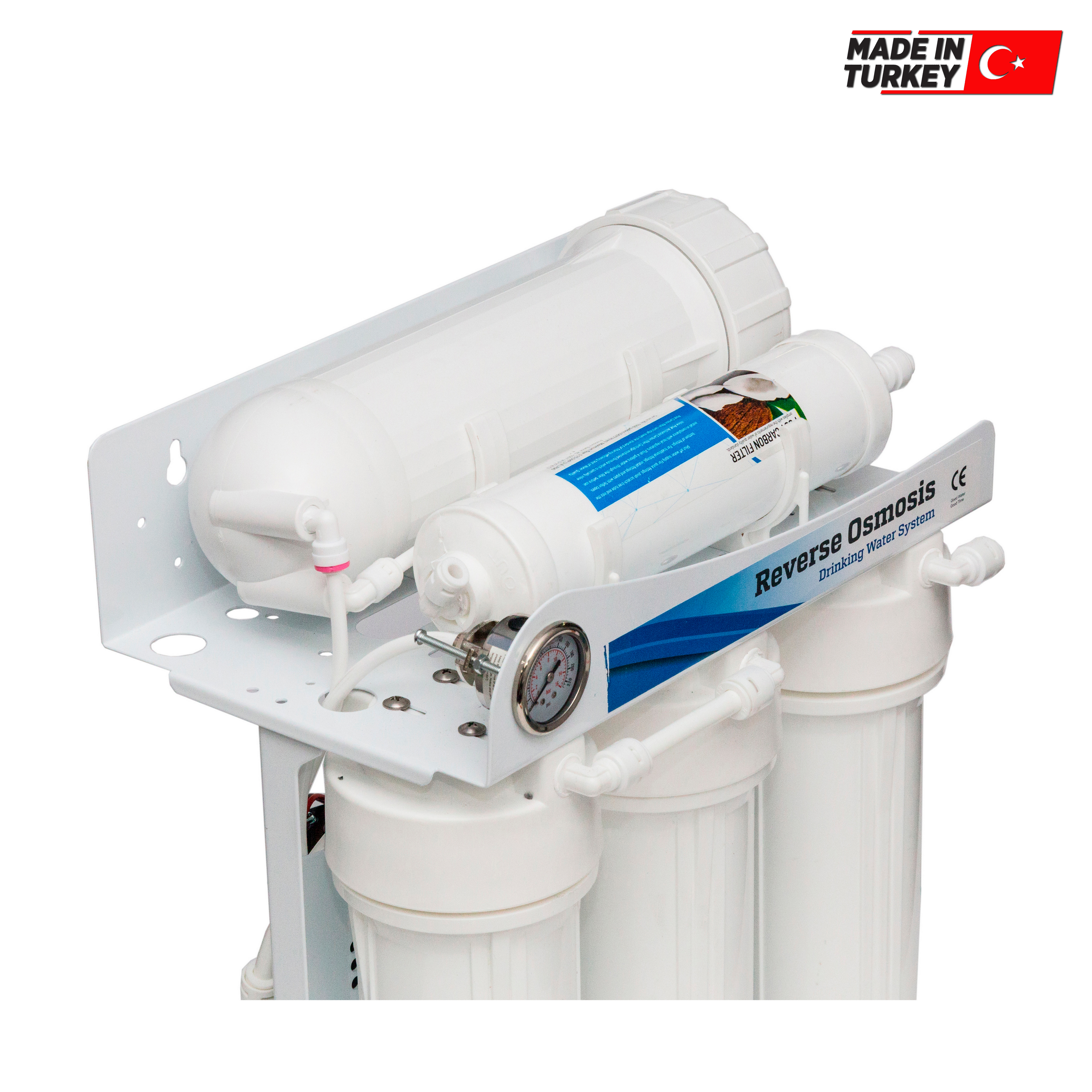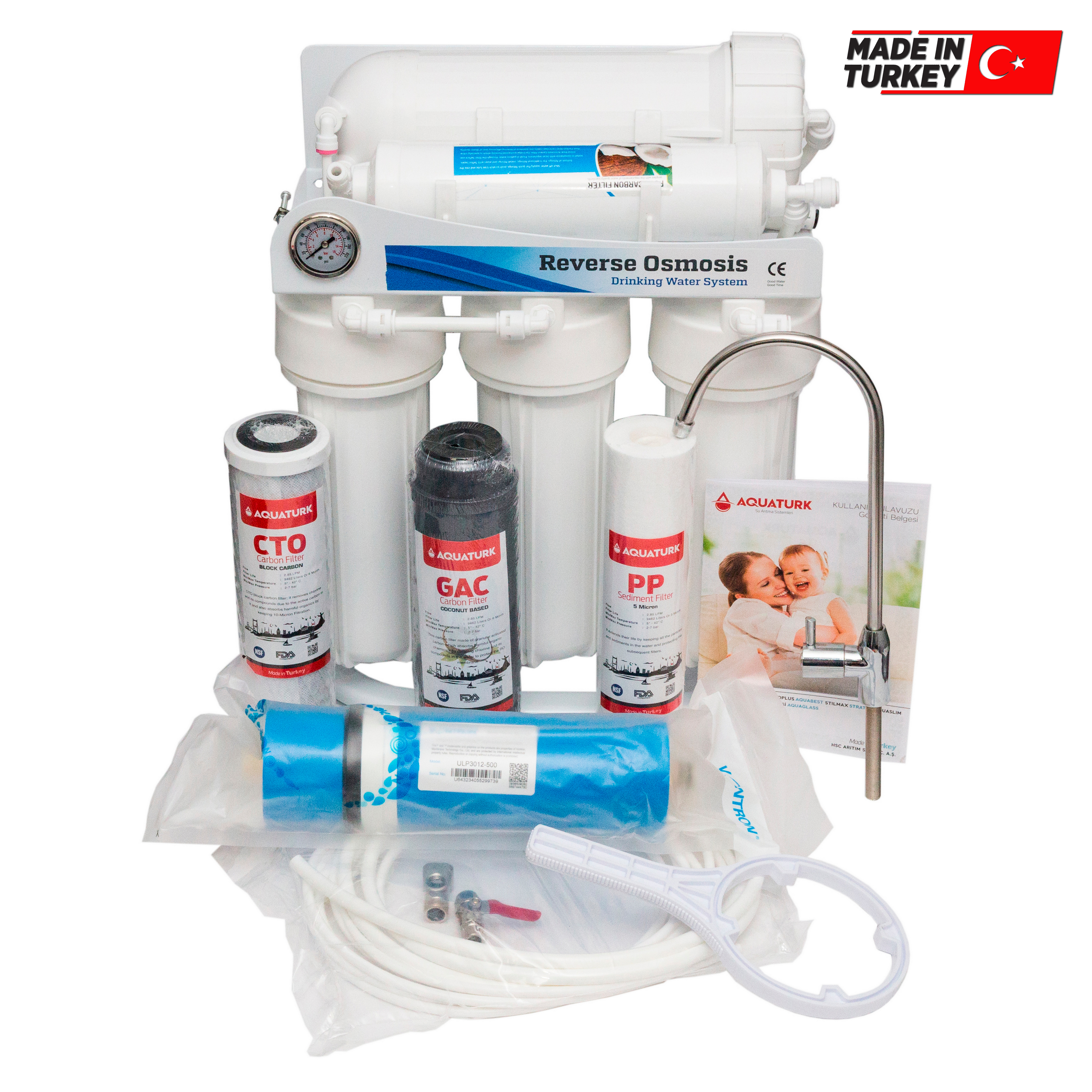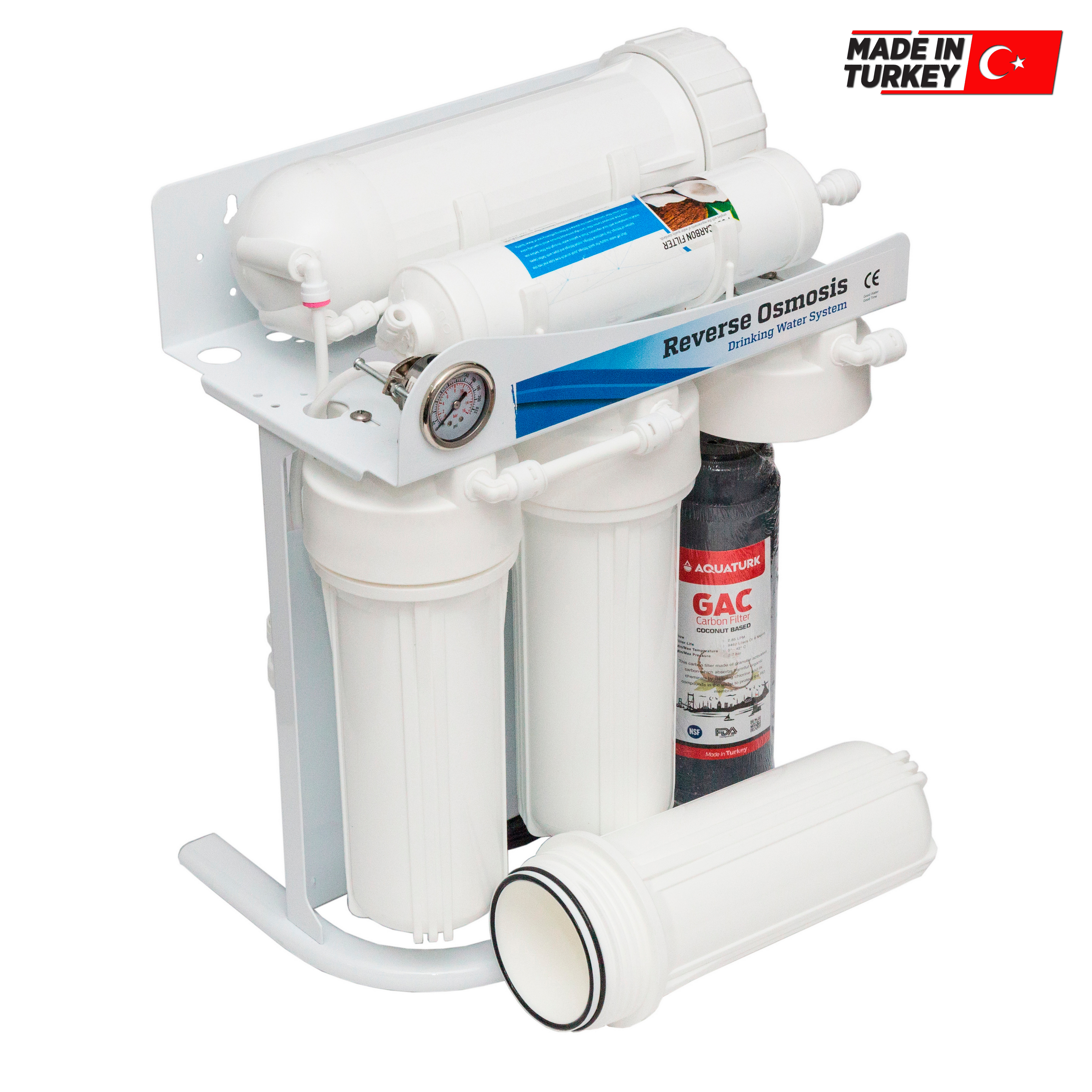 Aquaturk 300 - прямоточна система зворотного осмосу для очищення води на станині без бака. Це система від турецьких спеціалістів. Фільтр Aquaturk RO 300 (3-07-HF-12300) має 5 ступенів фільтрації та високопродуктивну мембрану в 300 Gal (1100 л/добу). Для підвищення тиску вихідної води система оснащена помпою. Дана система не шумить під час роботи, а встановлюється під кухонну мийку.