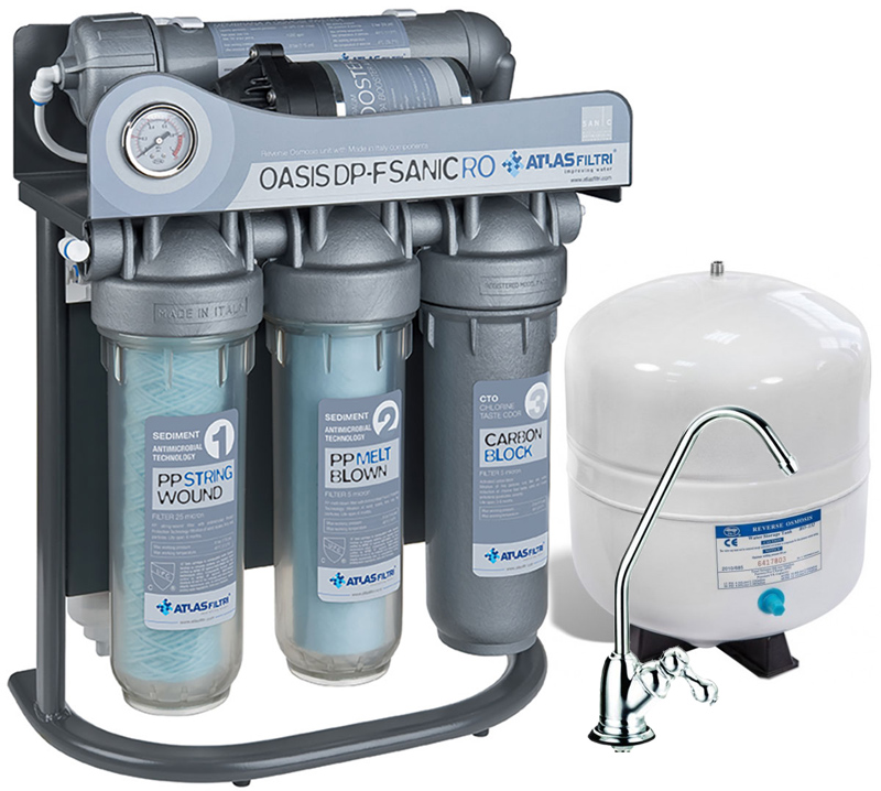 Atlas OASIS DP-F Sanic PUMP – це високоякісний фільтр зворотного осмосу, відомого італійського бренду Atlas Filtry. Компоненти фільтра виготовлені в Італії: картриджі, фітинги, колби – все дуже якісне та перевіряється відповідно до жорстких європейських норм.