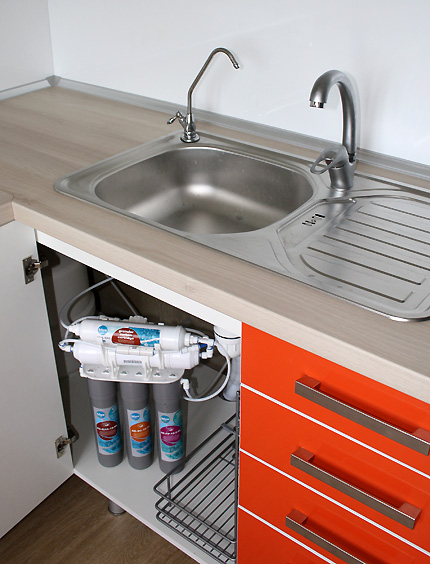 Фільтраційний блок і накопичувальний бак встановлюються під кухонною мийкою або в іншому місці, захищеному від впливу прямих сонячних променів. Фільтраційний блок з баком можуть розташовуватись як поруч, так і на певному видаленні, обмеженому довжиною приєднувальної трубки. Монтажні роботи включають встановлення і закріплення фільтраційного блоку, монтаж подвійного крана подачі очищеної води, підключення дренажного хомута для зливу, а також муфти і крана забору вихідної води з водопроводу.