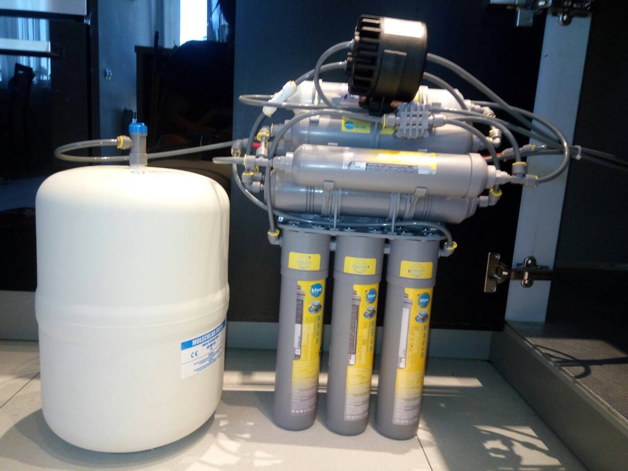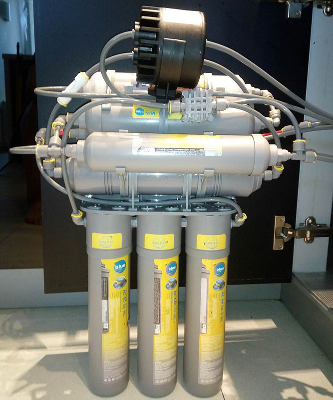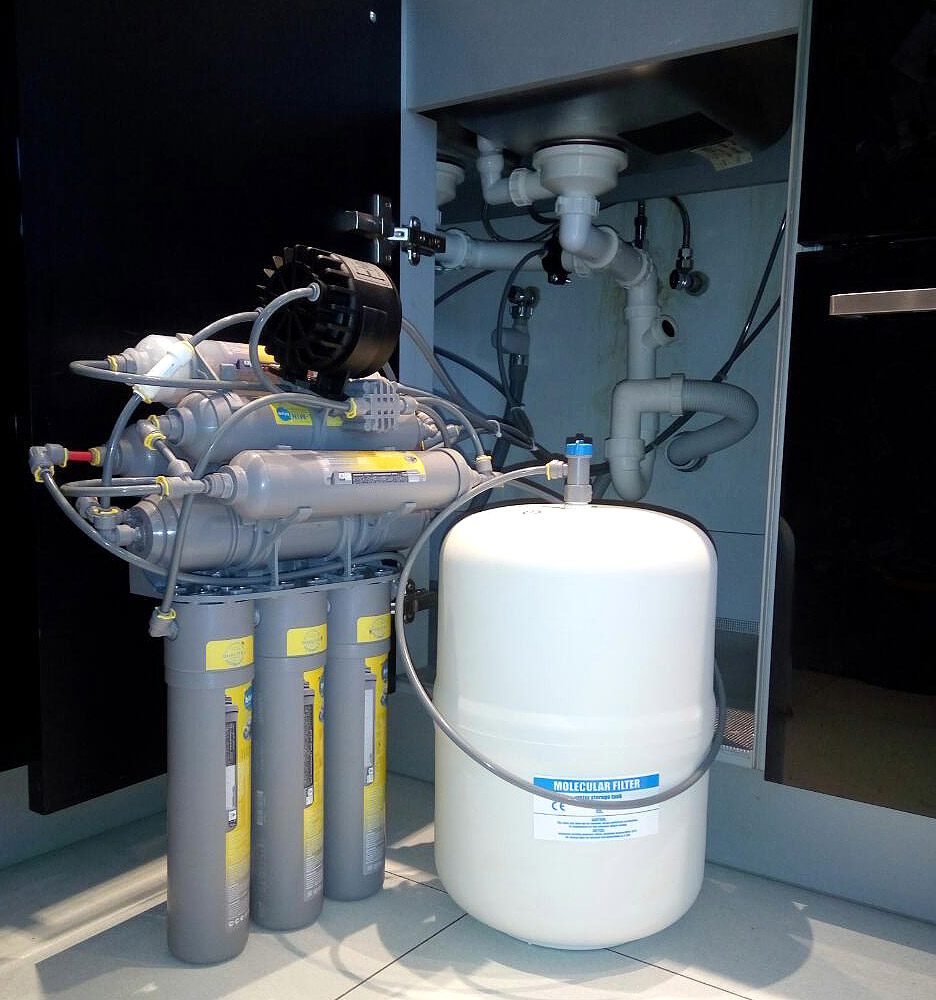 Фільтраційний блок і накопичувальний бак встановлюються під кухонною мийкою або в іншому місці, захищеному від впливу прямих сонячних променів. Фільтраційний блок з баком можуть розташовуватись як поруч, так і на певному видаленні, обмеженому довжиною приєднувальної трубки. Монтажні роботи включають встановлення і закріплення фільтраційного блоку, монтаж подвійного крана подачі очищеної води, підключення дренажного хомута для зливу, а також муфти і крана забору вихідної води з водопроводу.