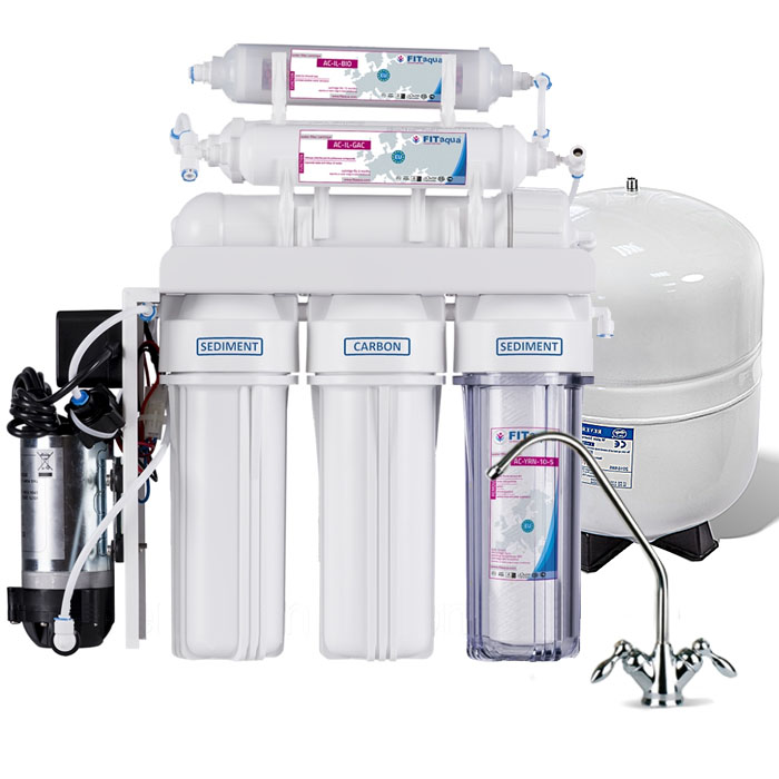 Фільтр зворотного осмосу з мінералізатором і насосом - Шестиступінчаста система очищення води включає попереднє триетапне очищення, фільтрацію за технологією зворотного осмосу, остаточне очищення за допомогою картриджа посткарбон і мінералізацію. Наявність мінералізатора у складі системи дозволяє забезпечити насичення води необхідними мікроелементами. Фільтр укомплектований помпою, яка встановлюється у тих будинках та квартирах, які мають низьконапірний трубопровід подачі холодної води. Насос, що підкачує, підвищує тиск на вході в мембрану до необхідних 3 - 6 атм.