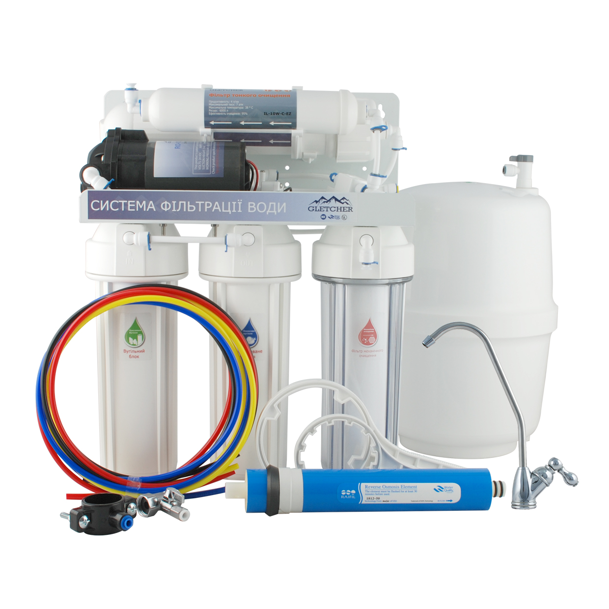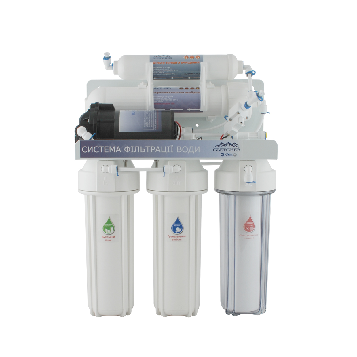 GLETCHER RO-5+ - система зворотного осмосу П'ятиступінчаста система очищення води включає попереднє триетапне очищення, фільтрацію за технологією зворотного осмосу, остаточне очищення за допомогою картриджа посткарбон. Фільтр укомплектований помпою, яка встановлюється у тих будинках та квартирах, які мають низьконапірний трубопровід подачі холодної води. Насос, що підкачує, підвищує тиск на вході в мембрану до необхідних 3 - 6 атм. Продуктивність фільтра – 280 літрів очищеної води на добу, що цілком достатньо для сімей із 3-6 осіб. Колби фільтра-універсальні, розмір 10". Що дозволяє використовувати змінні елементи будь-якого виробника.