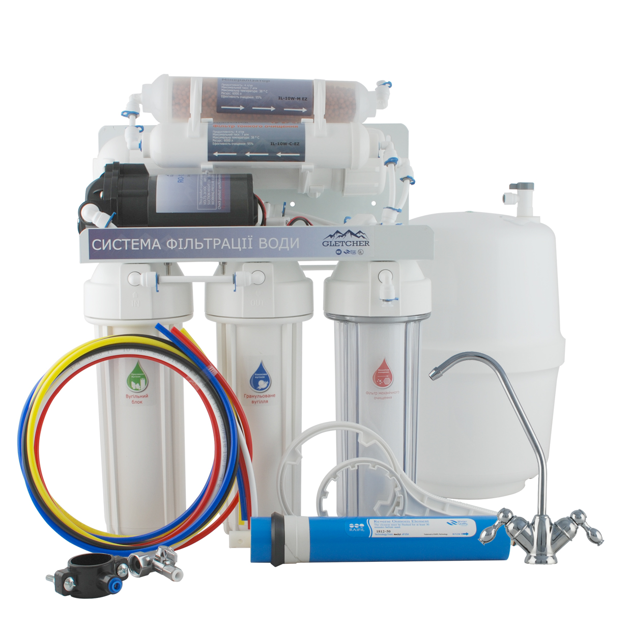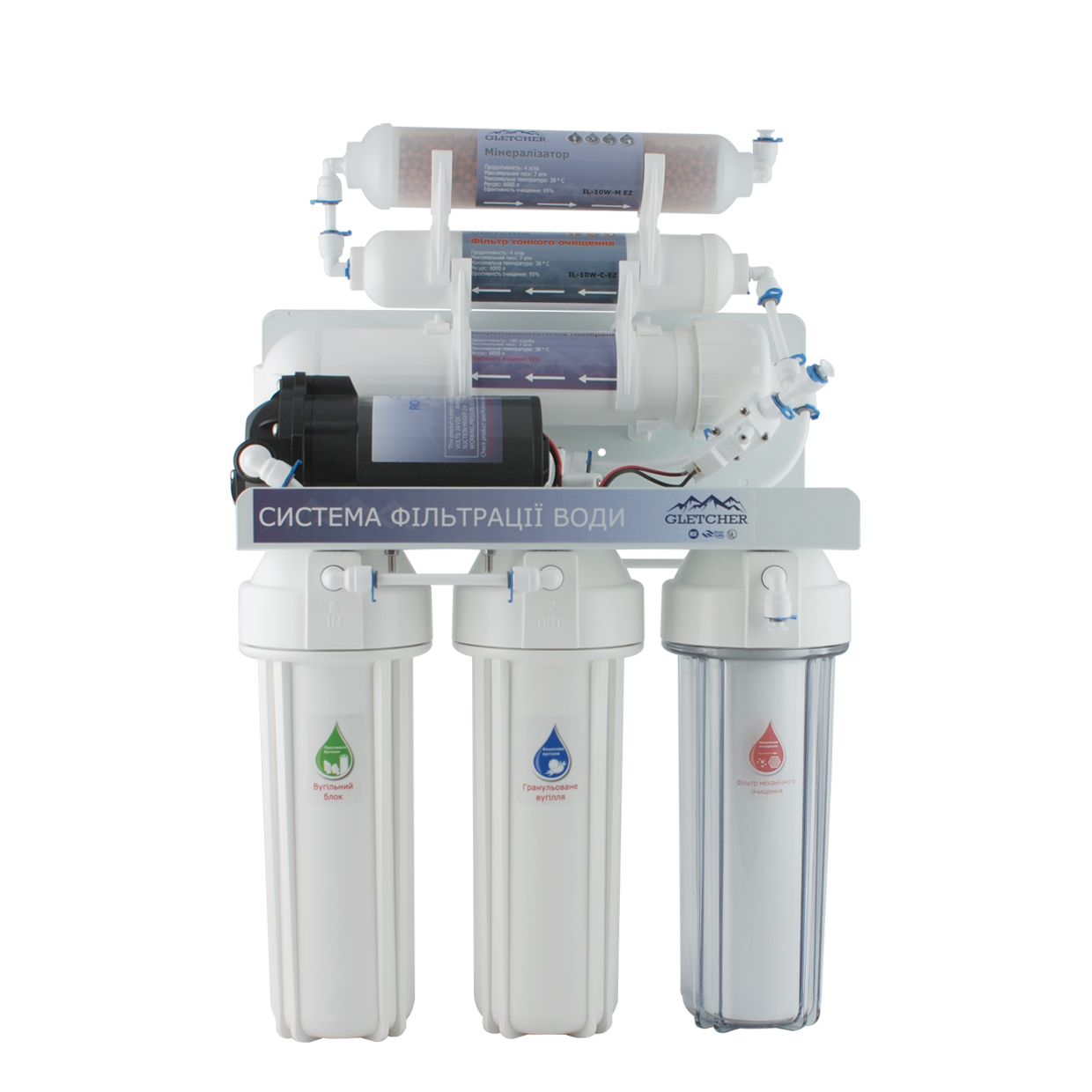 GLETCHER RO-6+ - система зворотного осмосу з мінералізатором і насосом - Шестиступінчаста система очищення води включає попереднє триетапне очищення, фільтрацію за технологією зворотного осмосу, остаточне очищення за допомогою картриджа посткарбон і мінералізацію. Наявність мінералізатора у складі системи дозволяє забезпечити насичення води необхідними мікроелементами. Фільтр укомплектований помпою, яка встановлюється у тих будинках та квартирах, які мають низьконапірний трубопровід подачі холодної води. Насос, що підкачує, підвищує тиск на вході в мембрану до необхідних 3 - 6 атм. Продуктивність фільтра – 280 літрів очищеної води на добу, що цілком достатньо для сімей із 3-6 осіб. Колби фільтра-універсальні, розмір 10". Що дозволяє використовувати змінні елементи будь-якого виробника.