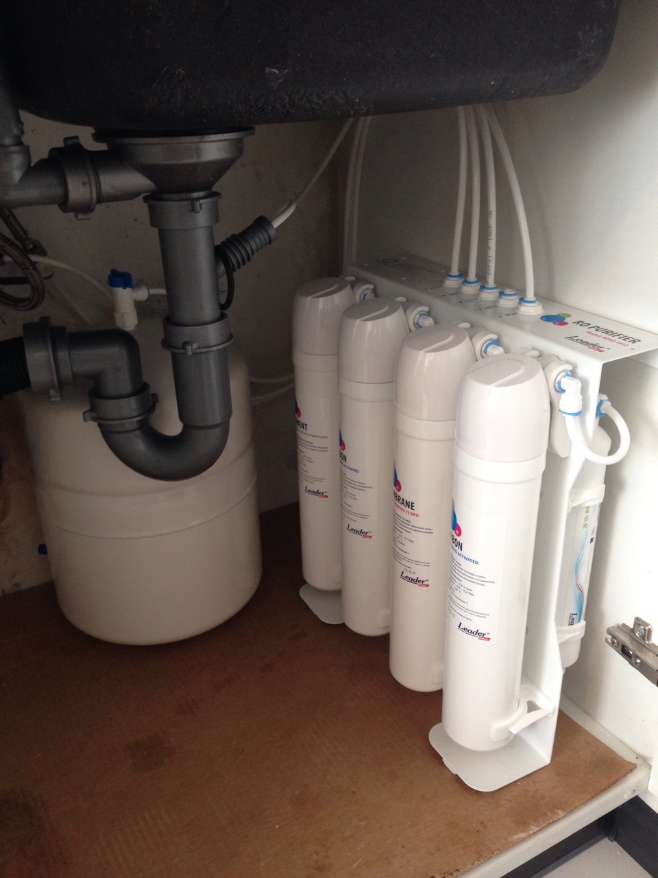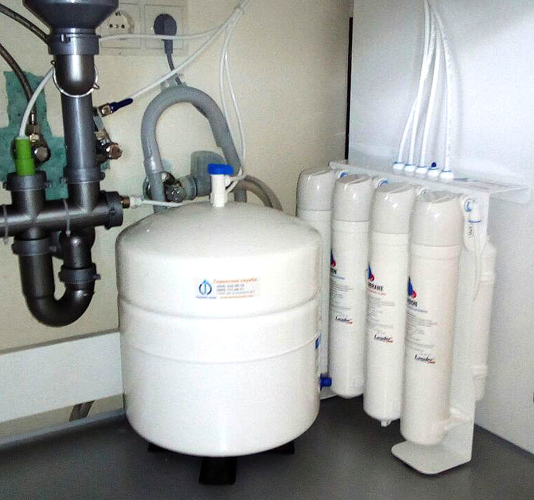 Фільтраційний блок і накопичувальний бак встановлюються під кухонною мийкою або в іншому місці, захищеному від впливу прямих сонячних променів. Фільтраційний блок з баком можуть розташовуватися як поруч, так і на певному видаленні, обмеженому довжиною трубки, що приєднує. Монтажні роботи включають встановлення і закріплення фільтраційного блоку, монтаж подвійного крана подачі очищеної води, підключення дренажного хомута для зливу, а також муфти і крана забору вихідної води з водопроводу.