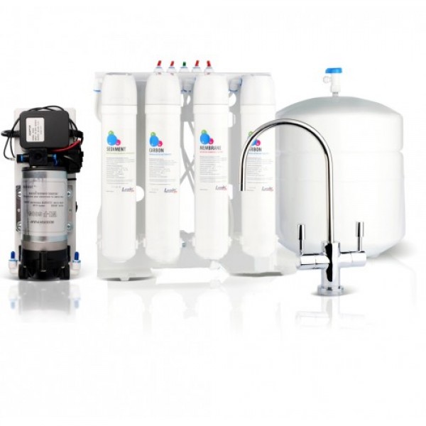 Помпа (насос) – Для якісної роботи зворотноосмотичної установки мінімально необхідний тиск у водопроводі має становити 2 атм. У випадках, коли тиск у водопроводі не досягає мінімально необхідного значення (деякі райони приватного сектора, верхні поверхи багатоповерхових будівель), пропонується установка системи зворотного осмосу з малогабаритним підвищуючим насосом. Така установка підключається до мережі 220 В і має автоматичний захист від сухого ходу (за відсутності води у водопроводі), а також реле відключення насоса в черговому режимі (при повному заповненні накопичувального бака).