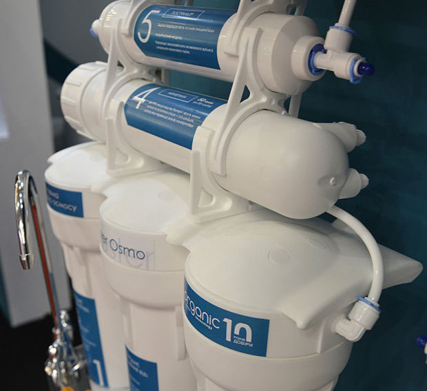 - Назад осмотична мембрана — фільтрує воду на молекулярному рівні, видаляючи розчинені солі, важкі метали та інші домішки.