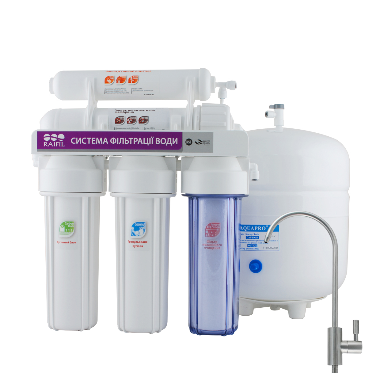 - Постфільтр (Raifil IL-11W-C) — на заключній стадії картридж з активованим вугіллям із шкаралупи кокосового горіха покращує смак та запах води, видаляючи залишкові запахи та покращуючи органолептичні властивості.