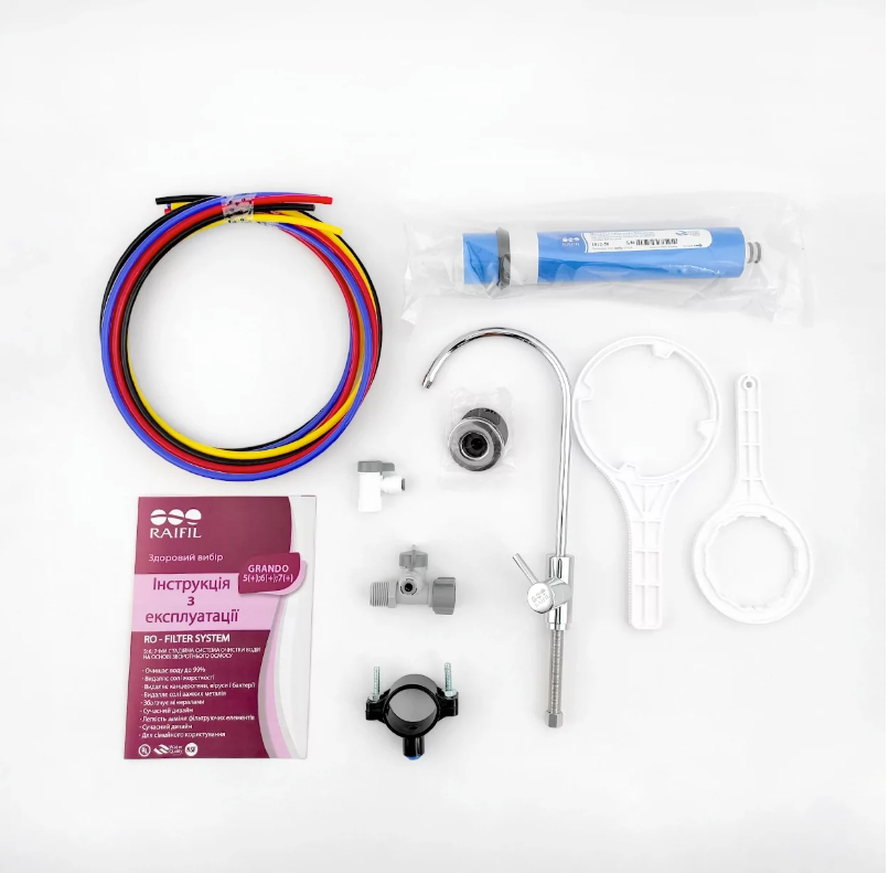 Фільтр зворотного осмосу Raifil GRANDO 5 (RO905-550-EZ) - це один із базових продуктів лінійки систем очищення води методом зворотного осмосу від торгової марки Raifil (Південна Корея). Дана система призначена для глибокого очищення води та забезпечує надійне видалення домішок та шкідливих речовин, що робить воду безпечною та смачною для щоденного використання.