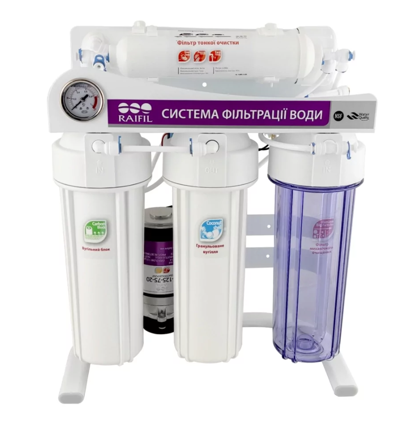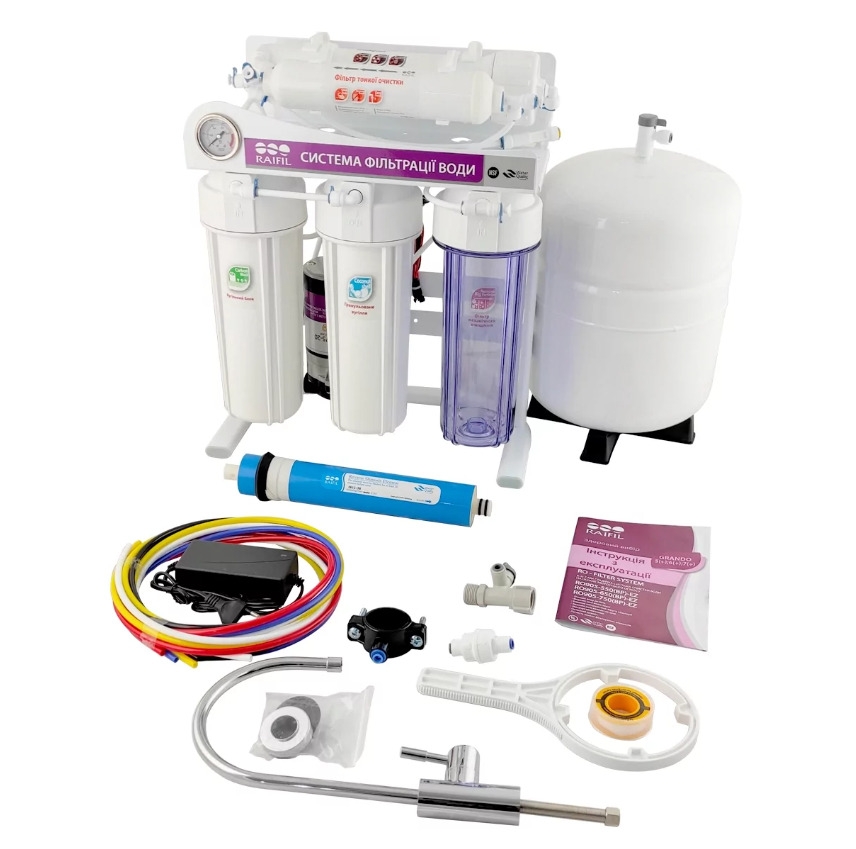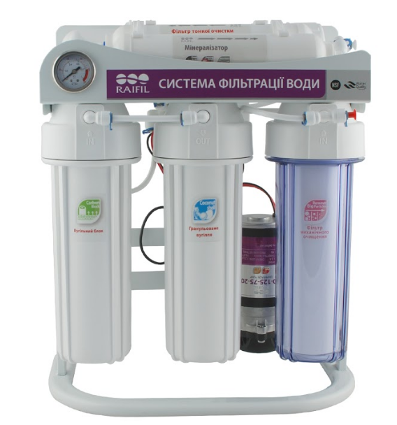 Фільтр зі зворотним осмосом Raifil GRANDO 5+ - п'ятиступінчаста система очищення на зручній металевій станині продуктивністю 75 GPD, манометром для контролю ступеня забруднення картриджів та помпою підвищення тиску (якщо тиск води в системі водопостачання падає нижче 3 атмосфер - включається насос і працює до підлоги накопичувального бака).