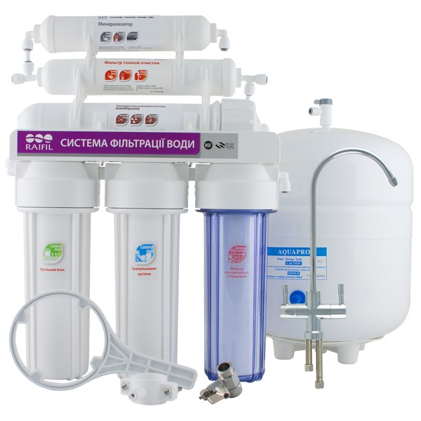 - Зворотноосмотична мембрана (Raifil) – видаляє до 99% домішок, включаючи віруси, бактерії, важкі метали, солі та інші розчинені речовини.