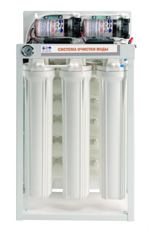 Raifil RO-388W-220-EZ - комерційна система зворотного осмосу для ресторанів та кафе, готелів та баз відпочинку, навчальних та мед. установ, а також місць, де потрібна підвищена кількість очищеної питної води. Продуктивності фільтра в 45 л/год достатньо для забезпечення середнього кафе або ресторану, приватного готелю і маленького санаторію. Для нормального функціонування Raifil RO-388W-220-EZ укомплектований двома насосами, які під тиском подають воду на мембрани зворотного осмосу.