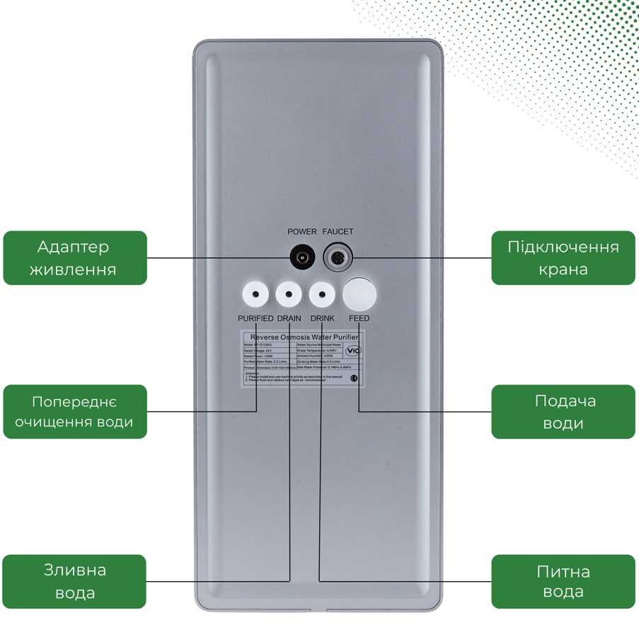 • RO-мембрана 800G — усуває до 99,9% розчинених солей, важких металів, бактерій, вірусів та інших шкідливих домішок