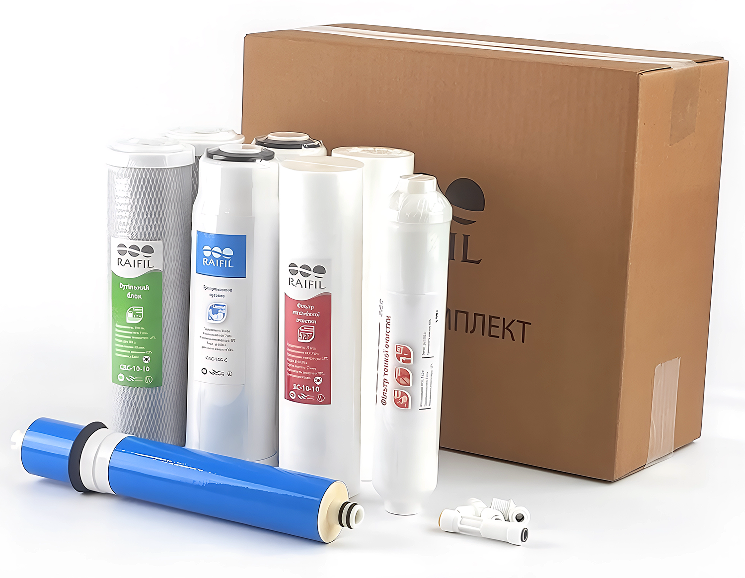 Набір картриджів призначений для заміни всіх п'яти елементів (трьох префільтрів, мембрани та постфільтра) у системах зворотного осмосу Raifil Grando 5/Grando 5+