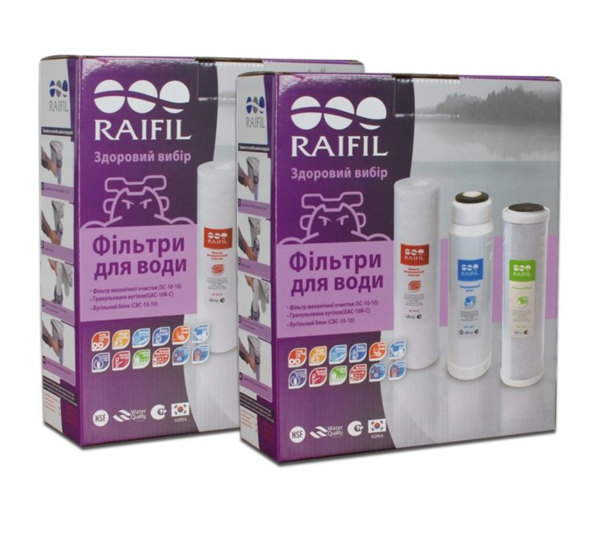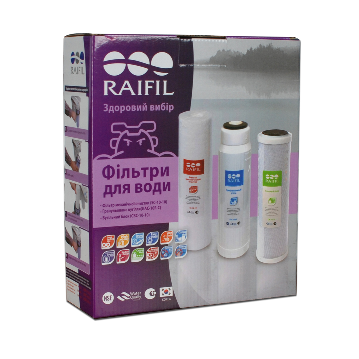Комплект складається з трьох картриджів, кожен із яких забезпечує послідовний етап попереднього очищення в системі фільтрації Raifil за технологією зворотного осмосу. Картриджі можуть застосовуватись у системах очищення інших виробників з аналогічним типорозміром колби. Комплект картриджів виконує такі завдання: