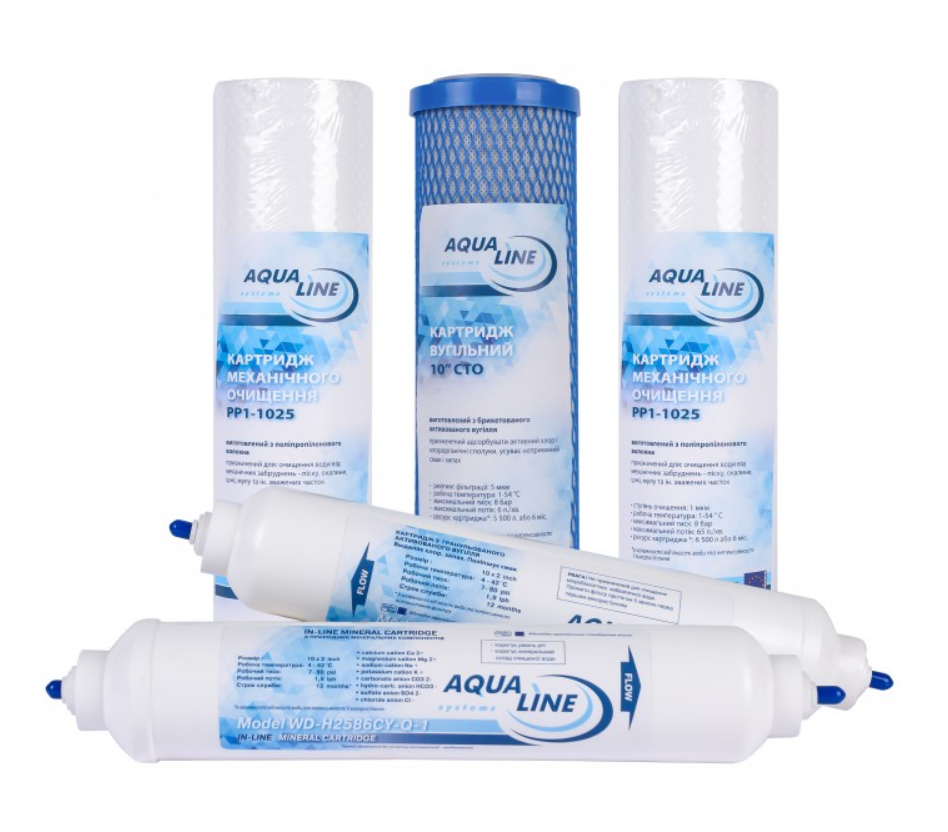 Повний комплект змінних елементів Aqualine RO-6 призначений для шестиступінчастих систем зворотного осмосу. Набір включає всі картриджі, необхідні для повної планової заміни: три префільтри, постфільтр та мінералізатор. Це забезпечує стабільну роботу системи, захист мембрани та одержання води високої якості з приємним смаком.