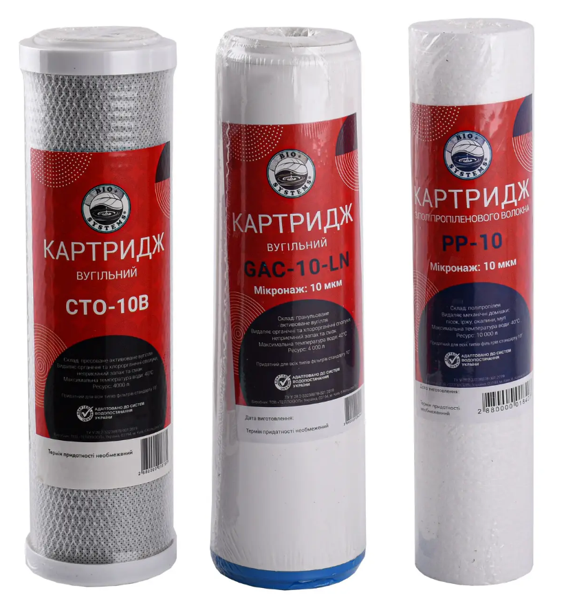 Комплект картриджів BioSystems-стандарт складається з трьох змінних модулів, кожен з яких використовується на певному ступені попередньої фільтрації. Картриджі можуть застосовуватись у системах очищення інших виробників з аналогічним типорозміром колби.