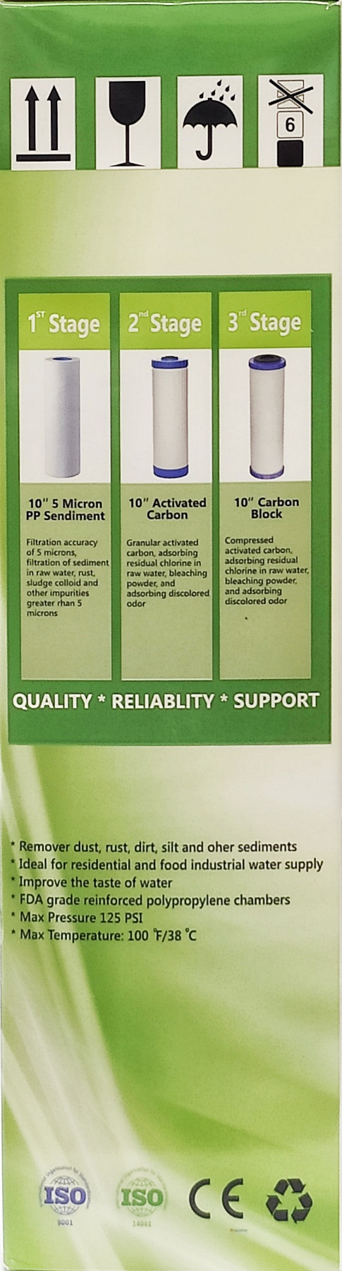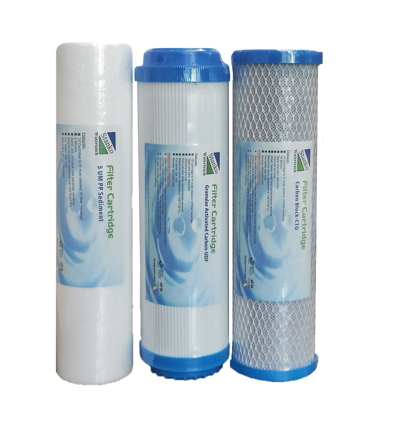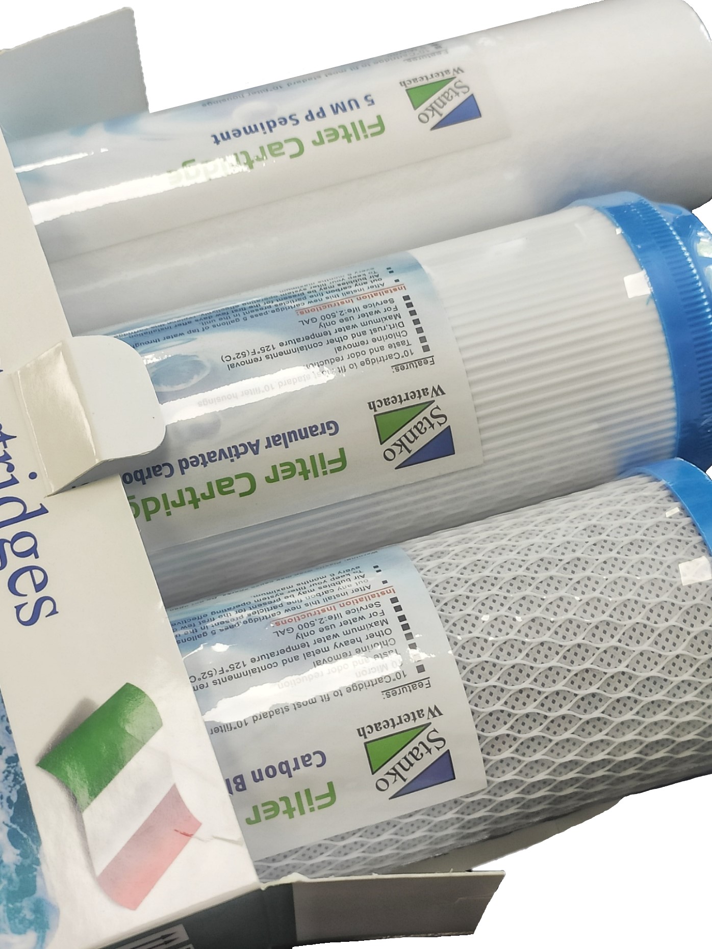 3. Картридж із брикетованого вугілля Stanko Waterteach СТО. Картриджі активованого вугілля містять спеціальне спечене вугілля з виключною адсорбцією хлору та інших льотних органічних субстанцій, що знаходяться у воді. Адсорбційно-активна поверхня спеченого вугілля майже в 2 рази більша від гранульованого вугілля. Завдяки цьому продовжується термін служби картриджів (для води вже очищеної попередньо) та збільшується площа поглинання забруднень. Вугільний картридж має поліпропіленове облицювання, яке запобігає виходу пилоподібних частинок вугілля зі вкладу.