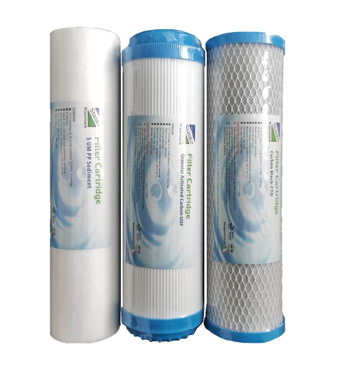 Комплект посилених картриджів Stanko Waterteach - це змінний набір трьох нижніх картриджів для попереднього очищення води з підвищеним вмістом хлору та органіки. Комплект складається з трьох картриджів, кожен з яких забезпечує послідовний етап попереднього очищення системи фільтрації. Картриджі можуть застосовуватись у системах очищення інших виробників з аналогічним типорозміром колби.