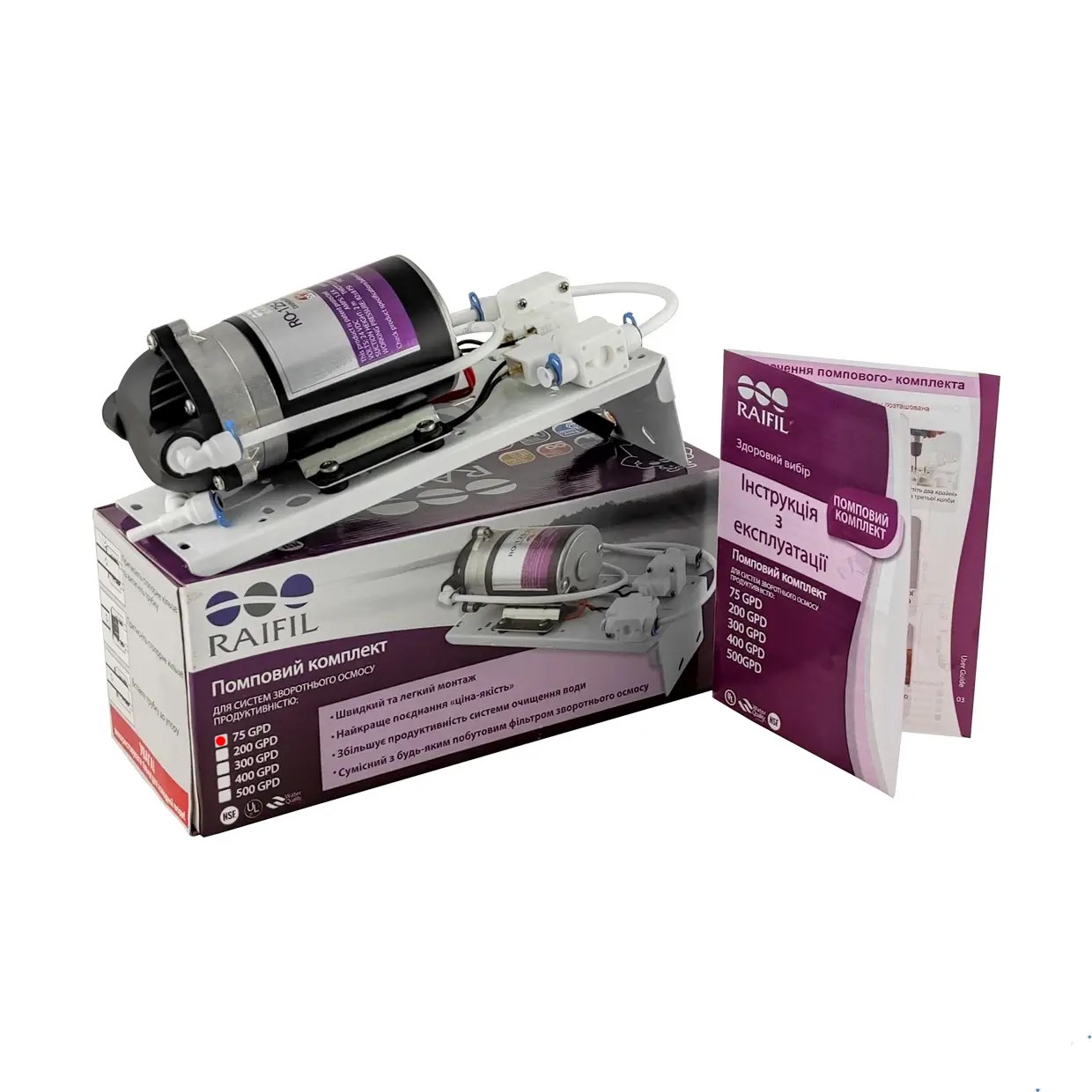 Насос (помпа) використовується для систем зворотного осмосу продуктивністю 50 і 75 GPD, коли тиск на вході в систему зворотного осмосу нижче необхідного для нормальної роботи (менше 2,8 атмосфер). Насос вмикається та вимикається автоматично залежно від споживання води та працює абсолютно безшумно. Комплектується насос датчиком низького та високого тиску, які відключатимуть насос у міру потреби. Споживання електроенергії мінімальне.