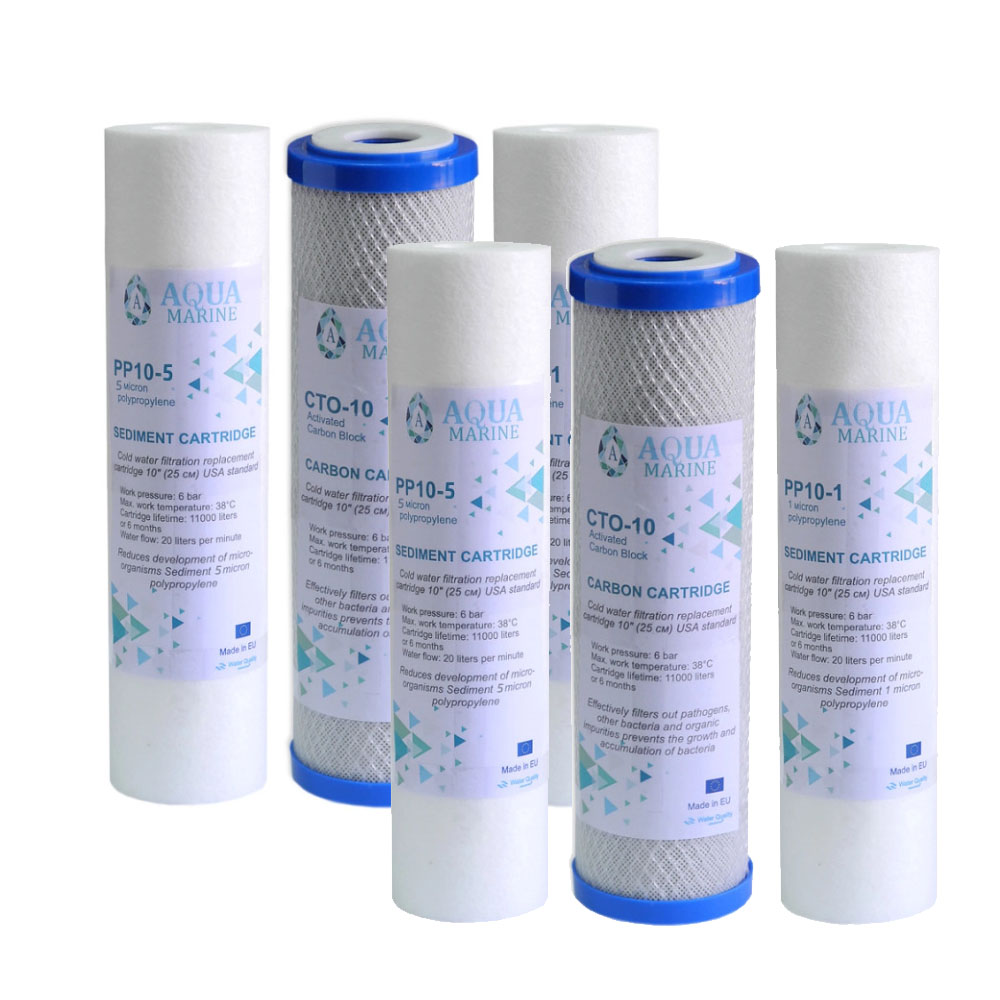 Вигідний набір з двох комплектів картриджів 1-2-3 для фільтрів зворотного осмосу AquaMarine - складається з шести змінних модулів, кожен з яких використовується на певному ступені попередньої фільтрації. Картриджі можуть застосовуватися в системах очищення інших виробників з аналогічним типорозміром колби стандарту 10". Термін служби картриджів від 3-х до 6 міс. Країна-виробник: Польща.