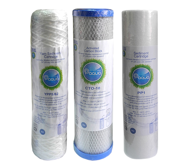 2-й ступінь попереднього очищення. Екологічний елемент, що фільтрує, з активованим вугіллям, приготований зі шкаралупи кокосових горіхів використовується у всіх осмотичних системах. Його головним завданням є видалення шкідливих сполук, які можуть зашкодити осмотичну мембрану. Виняткова пористість вугілля робить фільтр високо економічним. Затримує органічні та механічні забруднення, видаляє хлор та його похідні. Покращує смак, колір та запах води.
