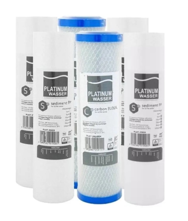 Комплект картриджів для фільтрів зворотного осмосу Platinum Wasser складається з трьох змінних модулів, кожен з яких використовується на певному ступені попередньої фільтрації. Картриджі можуть застосовуватися в системах очищення інших виробників з аналогічним типорозміром колби стандарту 10". Термін служби картриджів від 3 до 6 міс.