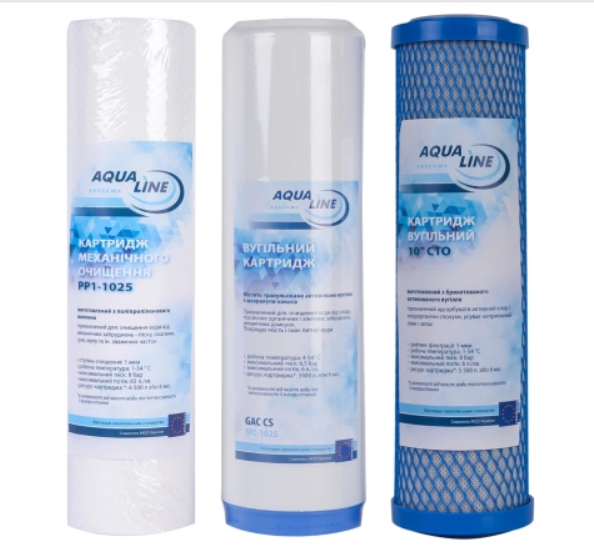 Комплект складається з трьох елементів: поліпропіленового картриджа 5 мкм, вугільного картриджа GAC UDF-10 та вугільного блочного картриджа CTO-1025. Разом вони забезпечують комплексне очищення від механічних, органічних, хлорвмісних та хімічних забруднень.