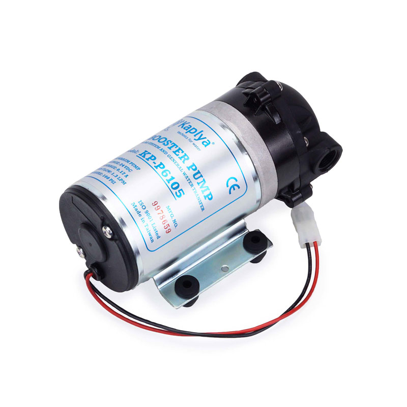 Насос для зворотного осмосу KP-P6105 – це нова модель насоса торгової марки Kaplya, призначеного для підвищення тиску води. Для роботи помпи також потрібні блок живлення, датчики високого та низького тиску (у комплект не входять). Якщо в джерелі подачі води низький тиск, система зворотного осмосу працюватиме некоректно або зовсім не подаватиметься чиста вода на накопичувальний бак і кран на мийці, відповідно. Помпа, що підвищує, Кaplya KP-P6105 використовується в побутових системах зворотного осмосу з мембранами 36-50-75-100 GPD (галон на добу).