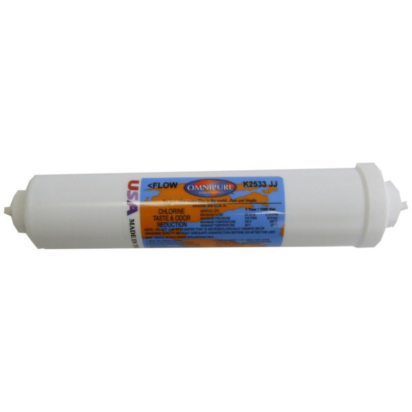 Картридж-посткарбон для систем зворотного осмосу Omnipure K2533JJ, 1/4 здійснює остаточне очищення води від хлору та покращення її органолептичних характеристик. Являє собою змінний елемент, що встановлюється як заключний ступінь очищення у фільтрах зворотного осмосу. Проходячи через активоване вугілля, позбавляється небажаних запахів і набуває свіжого смаку.