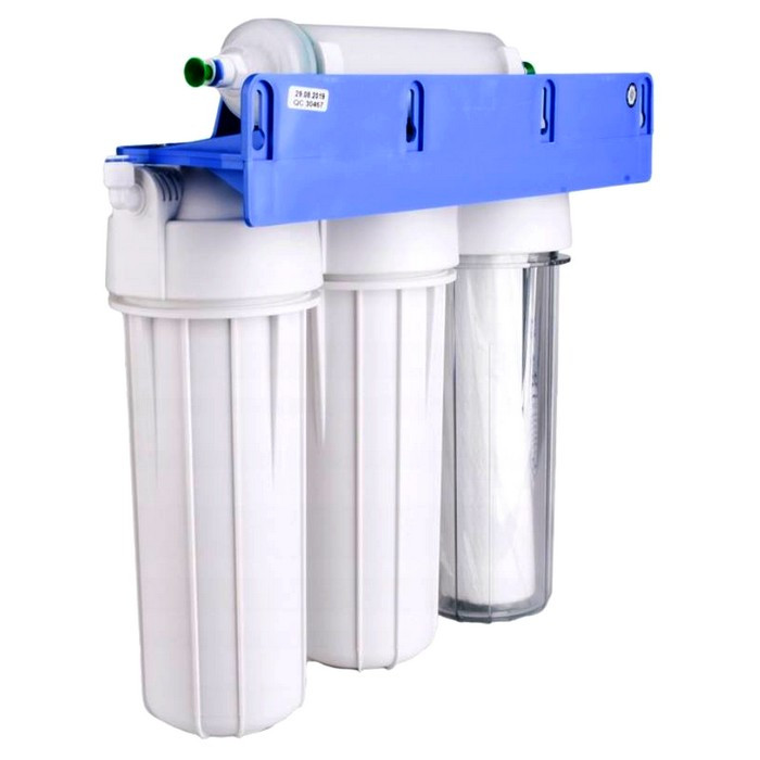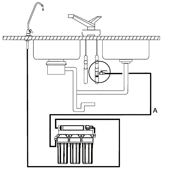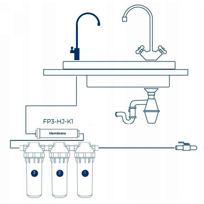 - Фільтр встановлюється під кухонною мийкою. Кран для очищеної води виводиться на мийку або стільницю. Усі необхідні для монтажу кріпильні та ущільнювальні елементи входять до комплекту постачання.