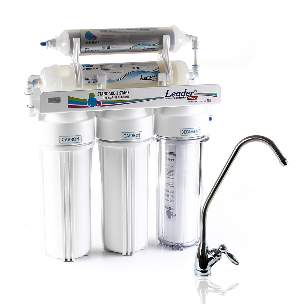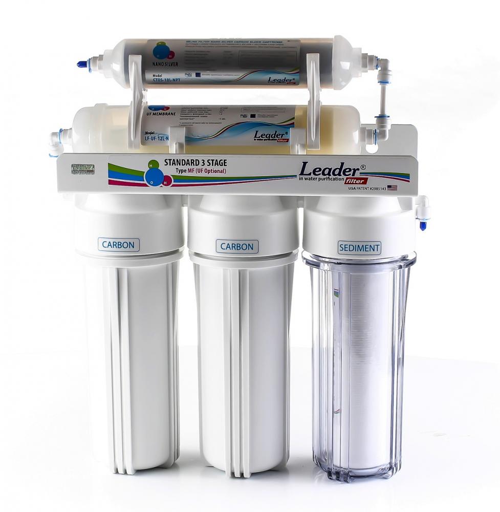Водоочисник під мийку 5-стадійний з UF мембраною Leader UF5 дозволить насолодитися смачною водою з крана у себе вдома. У системі Leader UF5 застосовано UF мембрану, яка видаляє з водопровідної води не лише шкідливі домішки, а й бактерії з вірусами. П'ятий ступінь фільтра – вугільний постфільтр Leader IN-LINE CTOS-10L-QC (NANO SILVER) із частинками НАНО Срібла. Очищає воду від неприємних запахів.