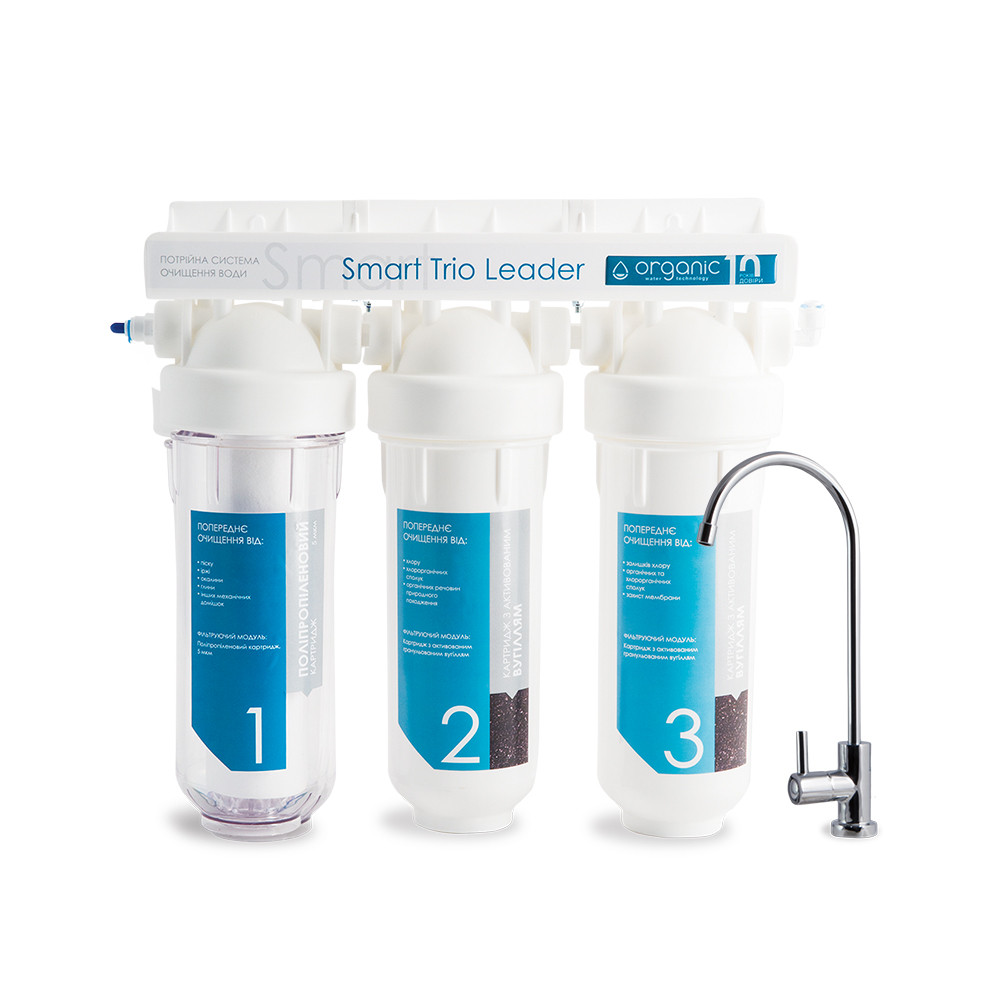 Фільтр проточного типу Organic Smart TRIO Leader – потрійна система очищення води, здатна ефективно боротися з високим вмістом солей жорсткості, залізом та органічними речовинами! Це вдосконалена модель фільтра Organic TRIO, в якому було змінено не лише зовнішній вигляд, а й комплектацію та якість змінних елементів.