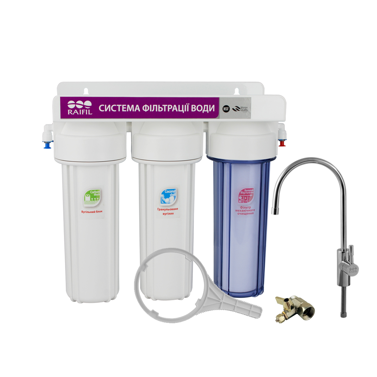 Raifi Trio – це картриджний фільтр проточного типу. Основні фільтруючі елементи фільтра – змінні картриджі. Кожен картридж очищає воду від певних забруднень. Після закінчення ресурсу картриджів їх потрібно замінити. Сигналом для заміни картриджів є погіршення якості води (поява накипу, запаху тощо).