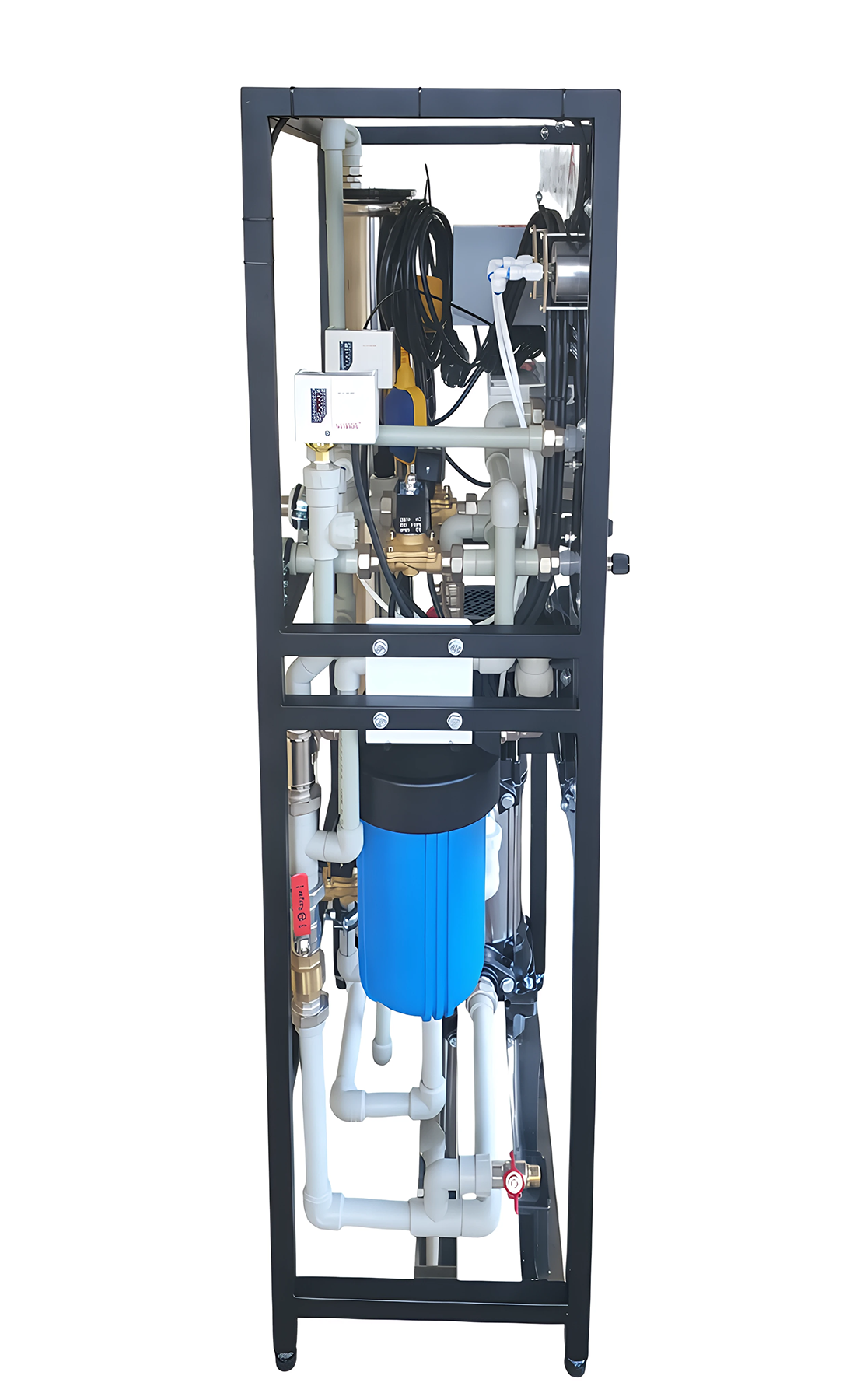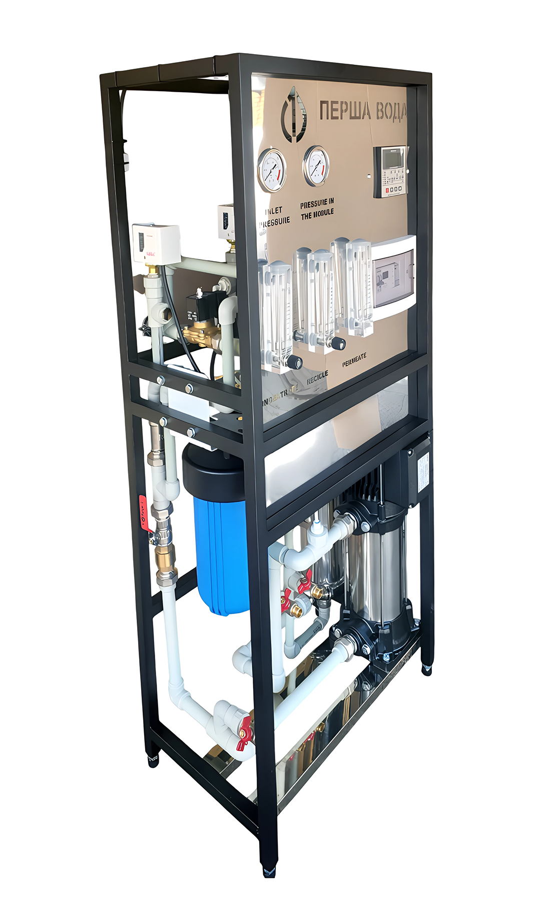 Система зворотного осмосу призначена для глибокого очищення та демінералізації води у промислових і комерційних об'єктах. Установка зібрана на міцній рамі з нержавіючої сталі, корпус пофарбований у чорний колір, а лицьова панель виконана з матової нержавіючої сталі — сучасне й надійне рішення для будь-якого виробничого середовища.