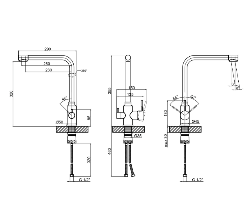 Легкий монтаж – стандартний монтажний отвір 35 мм, підключення через гнучке підведення довжиною 460 мм.